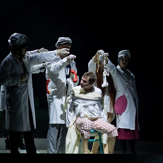 Еще одной интересной режиссерской находкой стала Аннушка (Наталия Латухина). В романе ее упоминают в начале и «показывают во плоти» ближе к финалу, когда она подбирает в темном подъезде золотую подкову «с камушками». В спектакле Аннушка проходит через все повествование, успевает и со зрителями пообщаться, собирая в зале стеклотару, и тем самым роковым трамваем порулить, и в варьете преобразиться (единственная, кстати, кто ничуть не смутился, когда парижское платье исчезло и пришлось продефилировать по сцене в одном белье), и даже временно примкнуть к демоническим психиатрам, терзающим несчастного Бездомного (Александр Зимин).